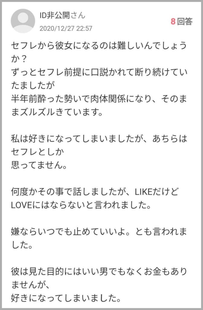 淡い期待を寄せて質問をします。もちろんセフレが既に彼女持ちだったり、告白したけどそもそもそうゆうつもりがない男性だったりとケースバイケースですが、最初は「もしかしたら恋人同士になれるかも」という期待の中であなたは誰かに質問をします。しかし、誰に相談しても帰ってくる答えは同じです。